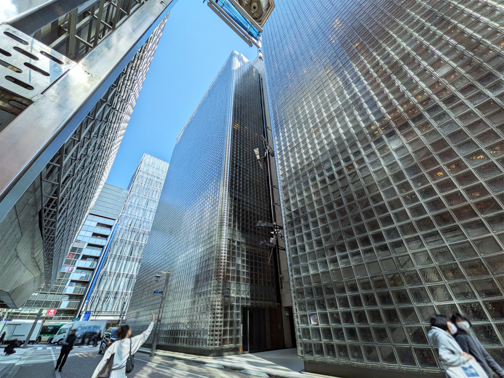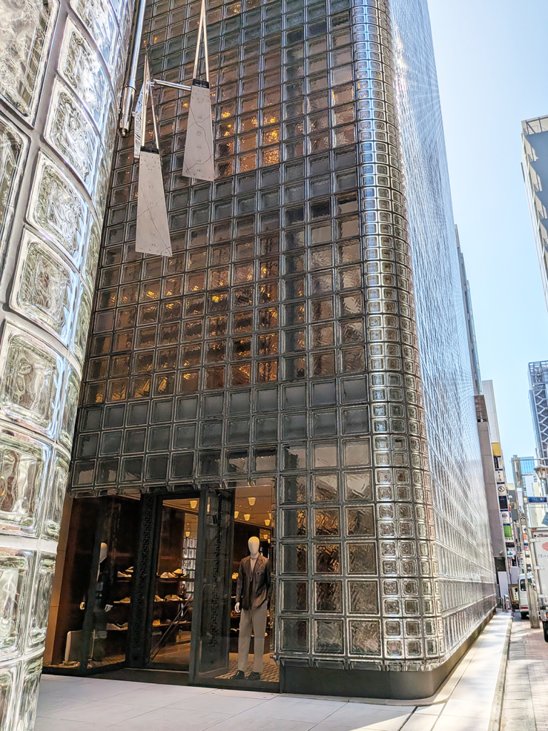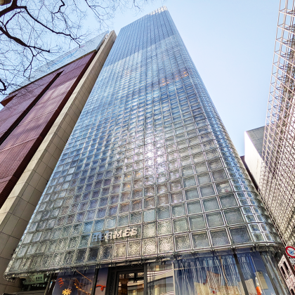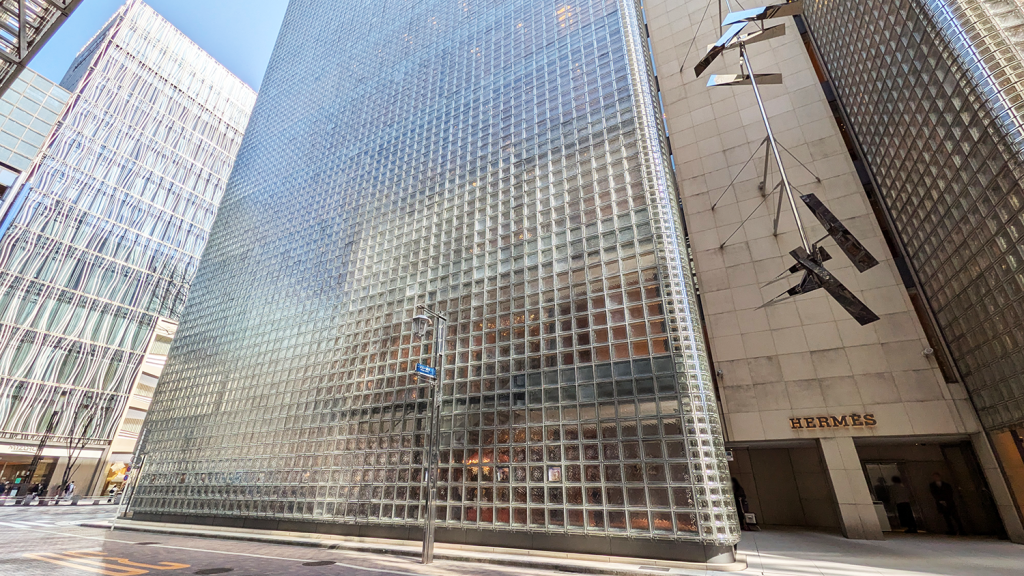 銀座には多くのガラス建築が存在しますが、メゾンエルメスは反射・透過・拡散というガラスの基本性質を非常に丁寧に使い分けています。
