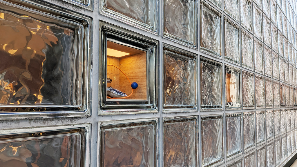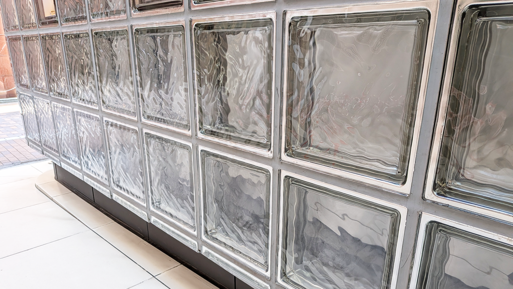 この建物を象徴するのが、壁面を埋め尽くす約45cm四方の特注ガラスブロックです。