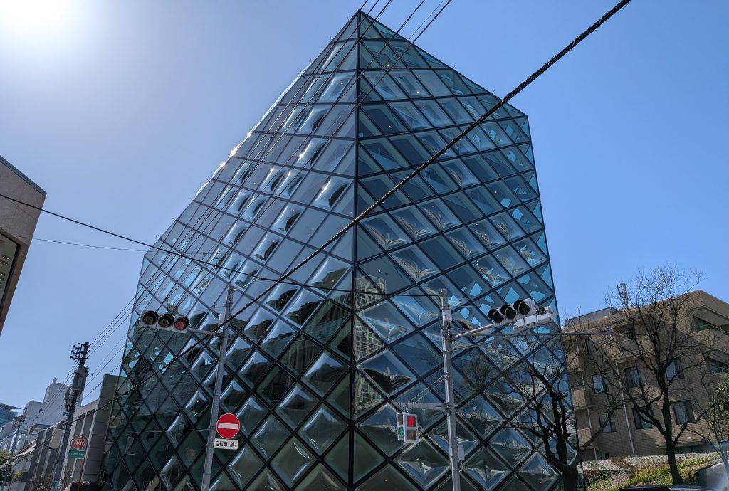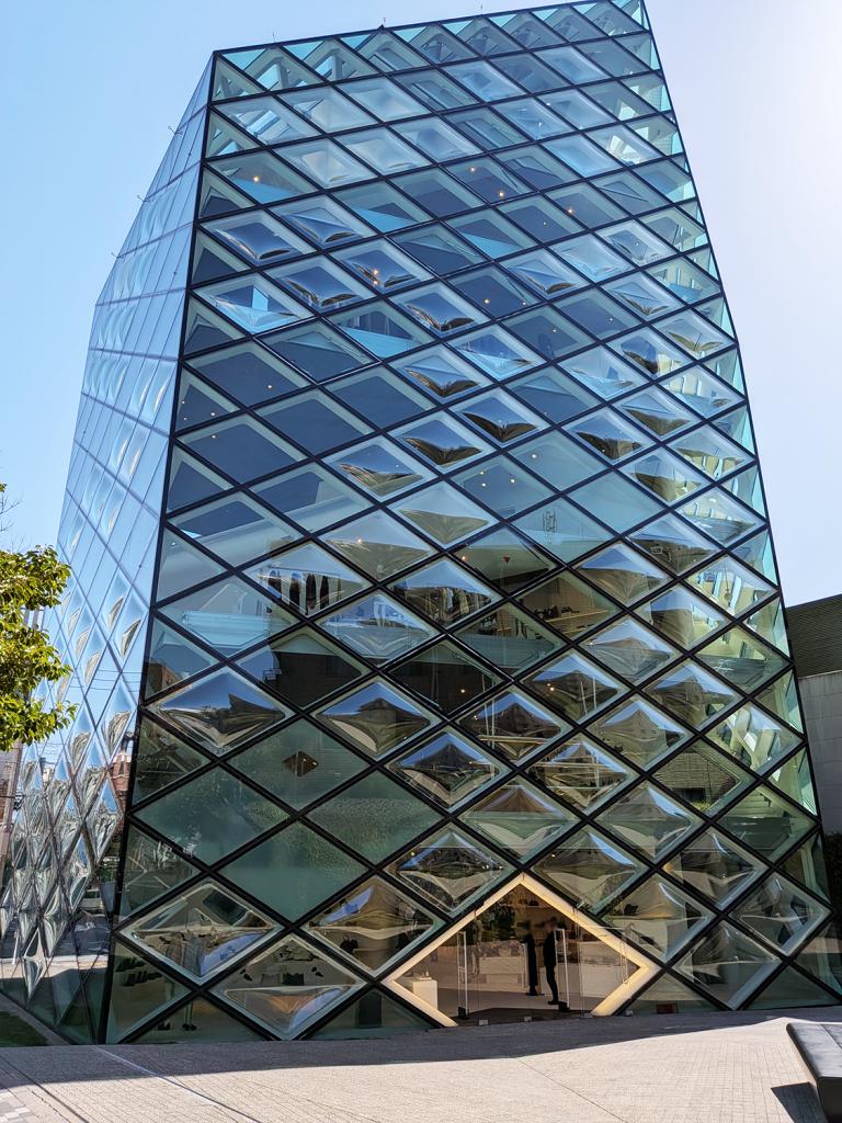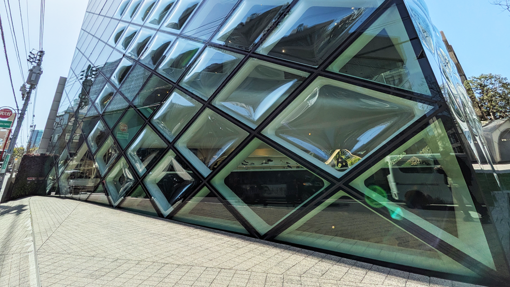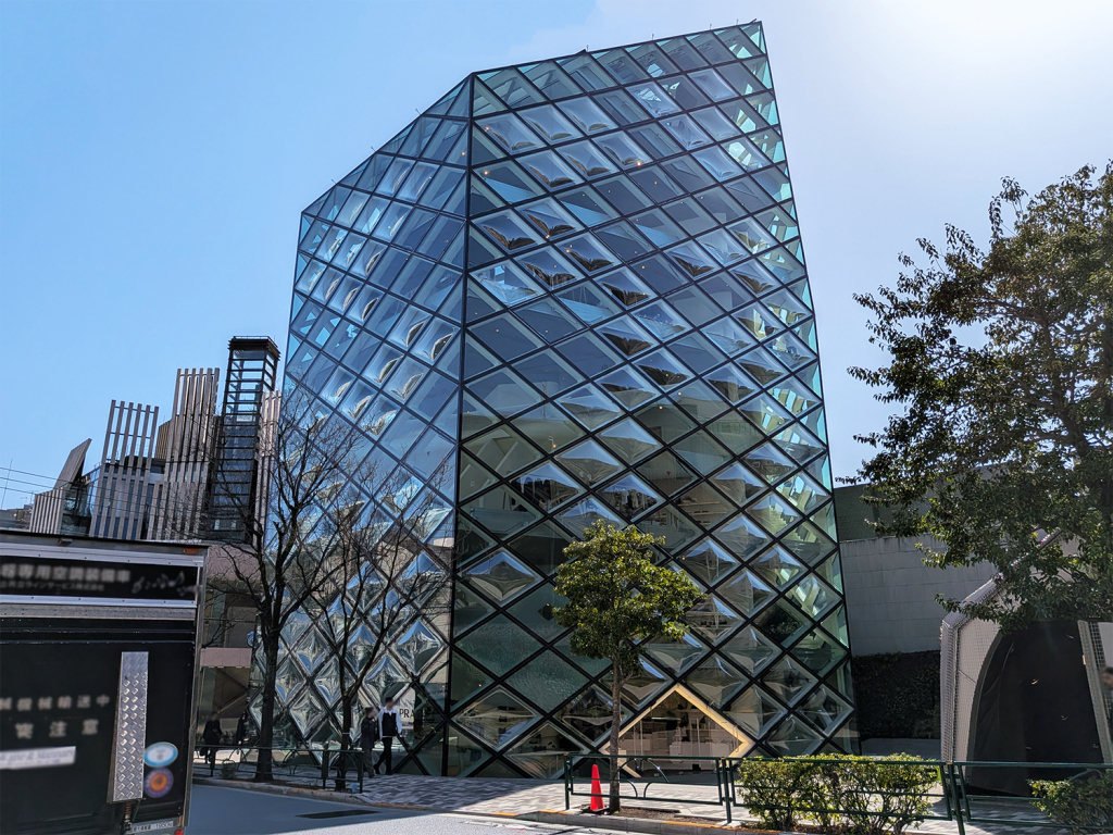 「プラダ ブティック青山」の最大の特徴は、建物全体を覆う菱形のガラスファサードです。