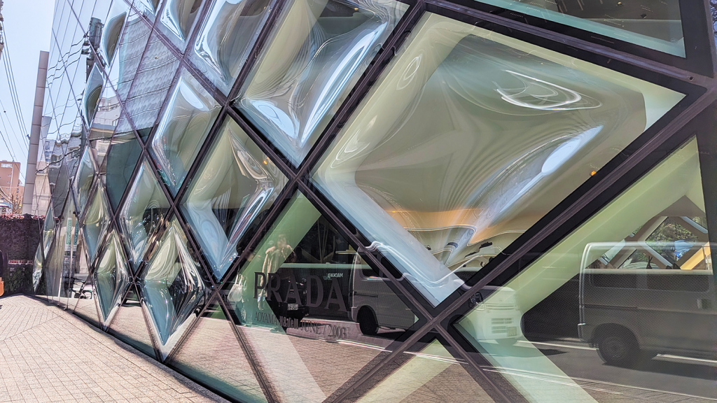 「プラダ ブティック青山」は、素材の透明性や反射を最大限に活かすことで、周囲の無機質なコンクリート建築とは一線を画す存在感を放っています。