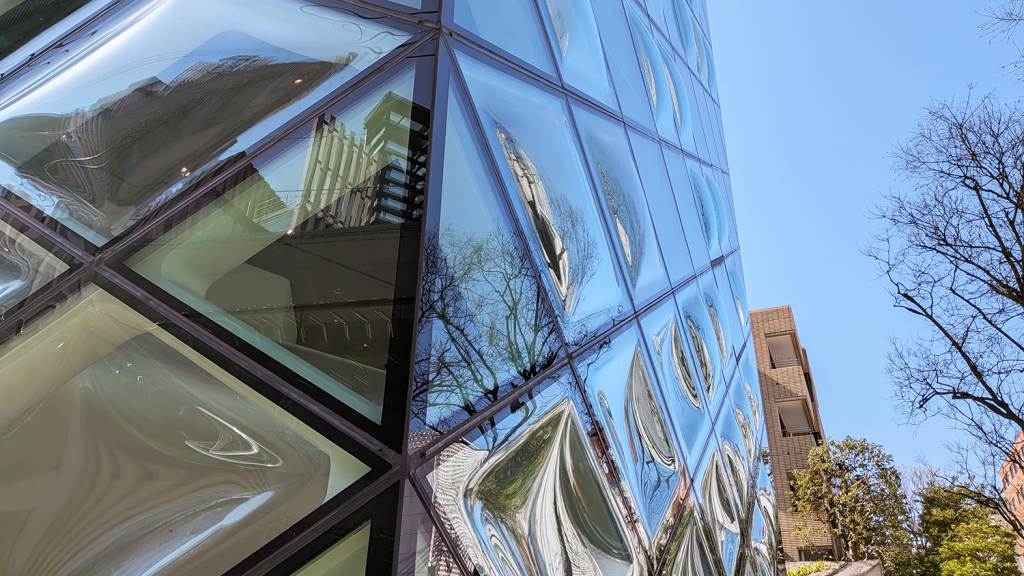 凹凸のあるガラスは周囲の景色を複雑に映し出し、建物全体に透明感と立体的な奥行きを与えています。