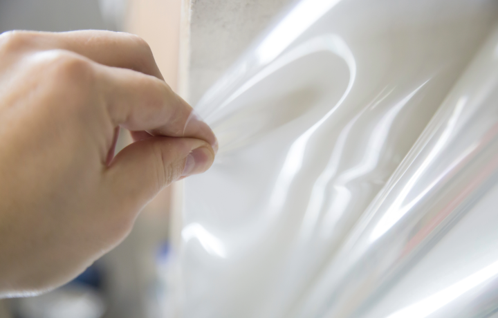 位置が決まったら、スキージーという道具でフィルムの上から圧力をかけ、水と空気を端へ押し出していきます。こうしてフィルムがしっかり密着していくのですが、どれだけ丁寧に作業しても、水分を完全にゼロにすることはできないため、多少の水残りは施工後にどうしても発生します。