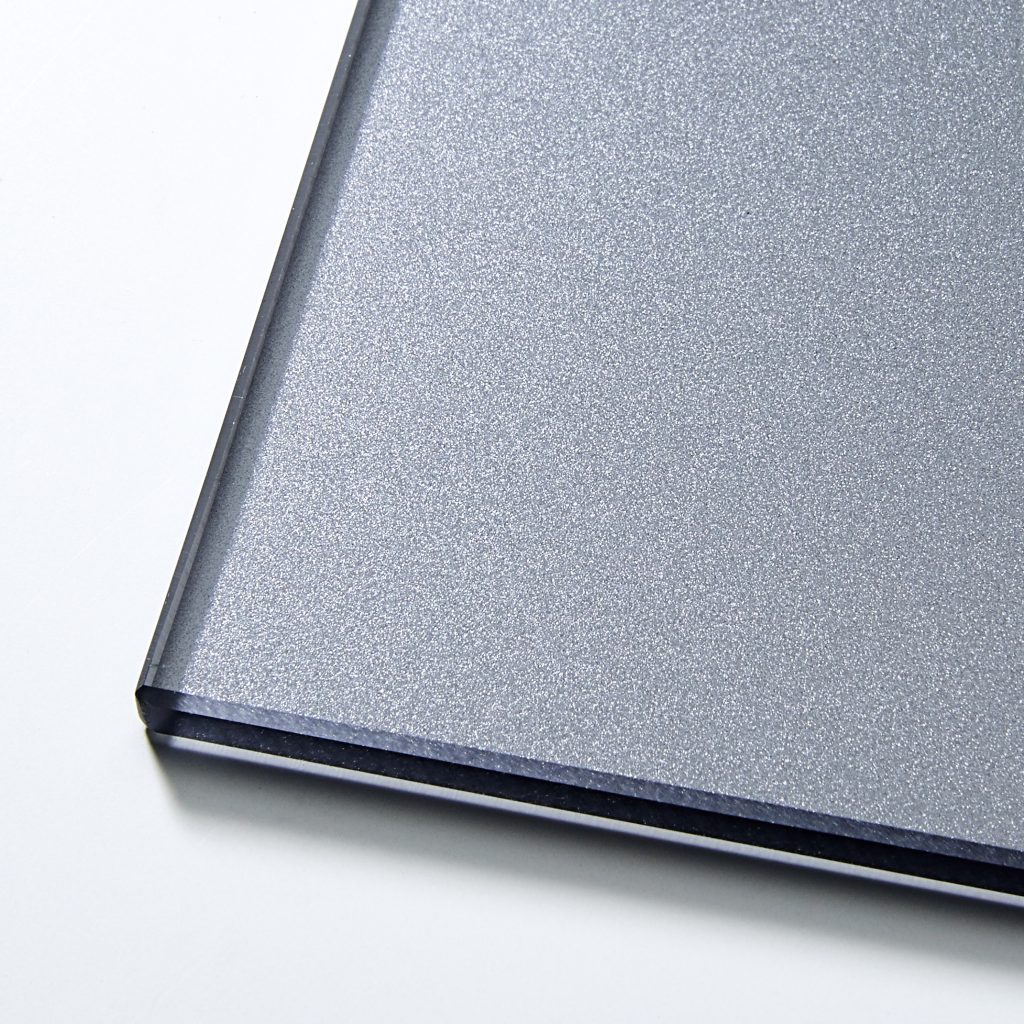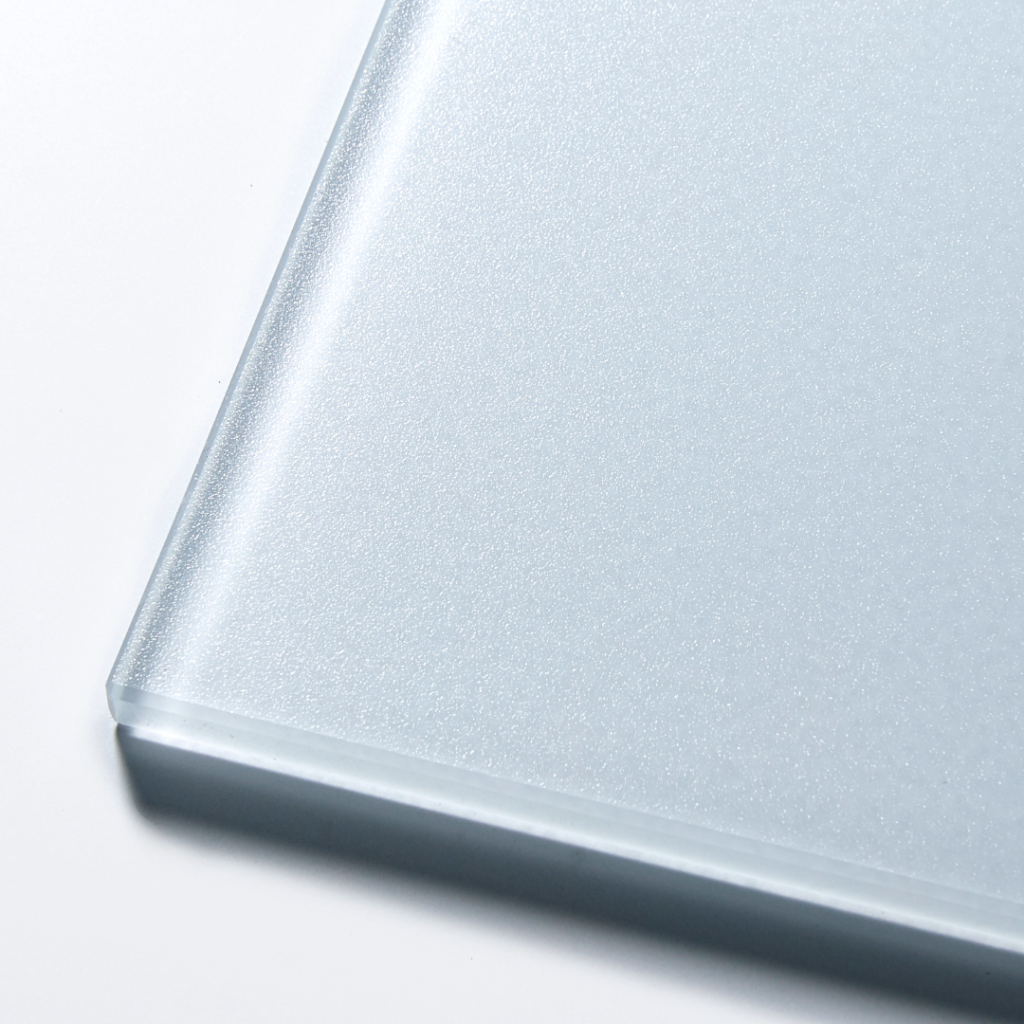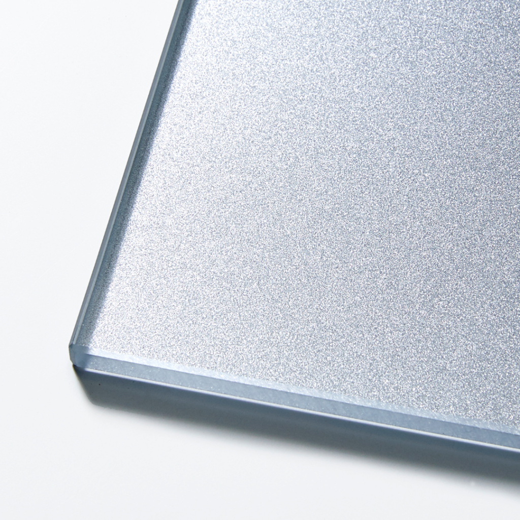これは高透過ガラスを使用したピュアカラーの表面に、さらにフロスト処理を施した製品で、色彩の鮮やかさを残しながらも、落ち着いた表情を見せてくれます。