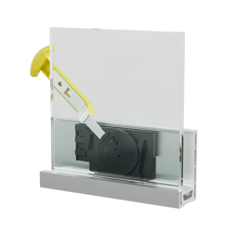 Q-DISCシステムは、万が一ガラスパネルが破損した場合でも、手摺全体(アルミプロファイル)を解体する必要がありません。専用ツールでディスクの固定を解除するだけで、損傷したパネルのみを容易に取り外し、新しいパネルに交換できます。